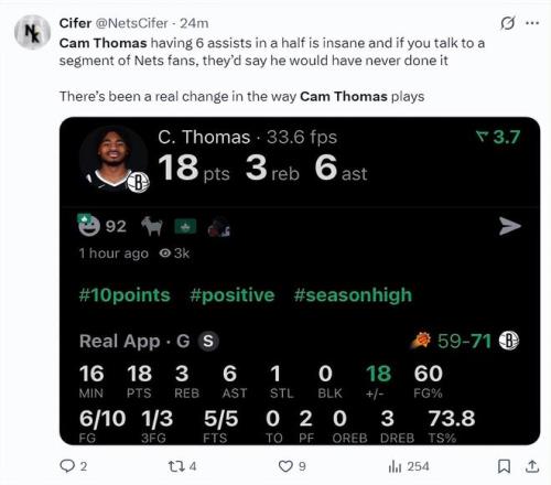 北京时间10月10日,NBA中国赛,篮网VS太阳,这场比赛是中国球员曾凡博的篮网首秀,但主角却是卡姆-托马斯,小火车这场比赛开场一波6中6连拿14分引来惊呼连连,三节打卡22分6助攻3篮板十分出彩。